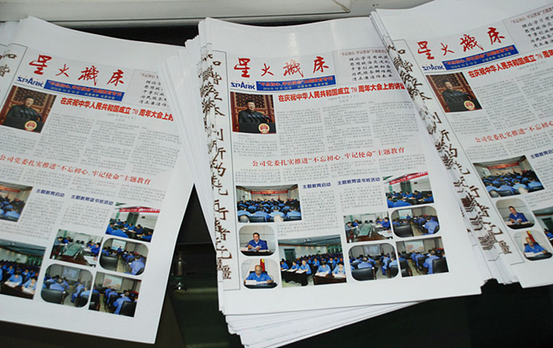 為使“不忘初心、牢記使命”主題教育往深里走,往實(shí)里做,幫助廣大黨員學(xué)懂弄通習(xí)近平新時(shí)代中國(guó)特色社會(huì)主義思想,掌握精髓,激發(fā)斗志,指導(dǎo)行動(dòng)。10月18日,經(jīng)過(guò)認(rèn)真準(zhǔn)備的星火機(jī)床《“不忘初心、牢記使命”主題教育??泛蛷V大黨員見(jiàn)面了。本期??晒军h委工作部部長(zhǎng)、公司“不忘初心、牢記使命”主題教育領(lǐng)導(dǎo)小組辦公室主任姚保忠策劃,黨委工作部有關(guān)人員精心組織稿件、選擇圖片進(jìn)行編排。專刊以習(xí)近平總書(shū)記在慶祝中華人民共和國(guó)成立70周年大會(huì)上的講話為統(tǒng)領(lǐng),分欄目反映了公司“不忘初心、牢記使命”主題教育動(dòng)員部署大會(huì)、主題教育讀書(shū)班、慶祝新中國(guó)成立70周年歌詠比賽,市委“不忘初心、牢記使命”主題教育第八巡回指導(dǎo)組指導(dǎo)檢查、專題黨課、“不忘初心、牢記使命”主題教育知識(shí)競(jìng)賽,黨支部書(shū)記參加全市“不忘初心、牢記使命”主題教育培訓(xùn),公司黨員參觀全市慶祝新中國(guó)成立70周年成就展,公司黨委檢查督導(dǎo)基層支部黨建工作,以及公司主題黨日活動(dòng)和優(yōu)秀黨員事跡介紹等。專刊彩色印刷,以圖為主、圖文并茂,既是對(duì)公司開(kāi)展“不忘初心、牢記使命”主題教育的全面報(bào)導(dǎo),又是廣大黨員掌握主題教育動(dòng)態(tài)、開(kāi)展學(xué)習(xí)的輔導(dǎo)材料,受到了黨委領(lǐng)導(dǎo)的肯定和黨員的好評(píng)。