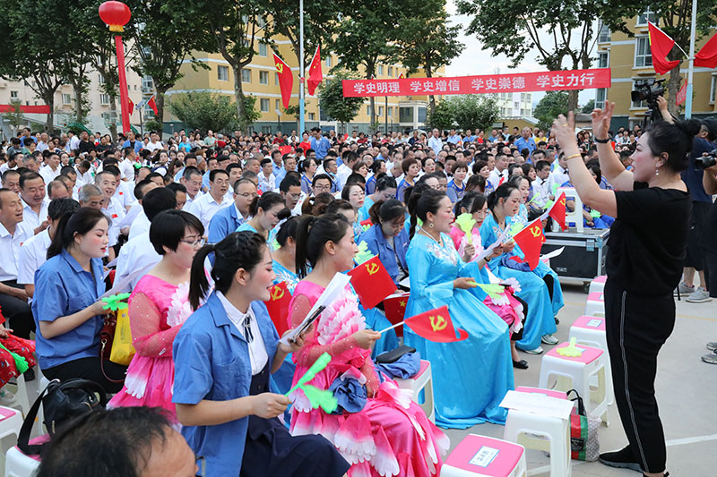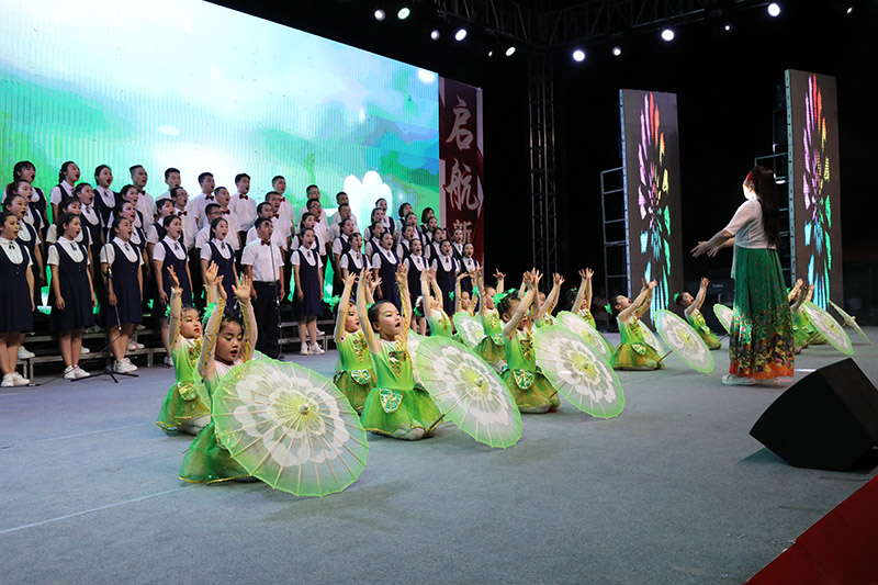 演出現(xiàn)場(chǎng),一面面鮮紅的黨旗國(guó)旗隨風(fēng)飄揚(yáng),一條條宣傳標(biāo)語(yǔ)隨著氣球在高空飄蕩,喜慶歡快的音樂(lè)余音繞梁。一張張笑臉喜氣洋洋,歡笑聲此起彼伏,發(fā)光拍手噼啪作響,手搖黨旗國(guó)旗有節(jié)奏的擺動(dòng),“拉歌”的吶喊聲一浪高過(guò)一浪……