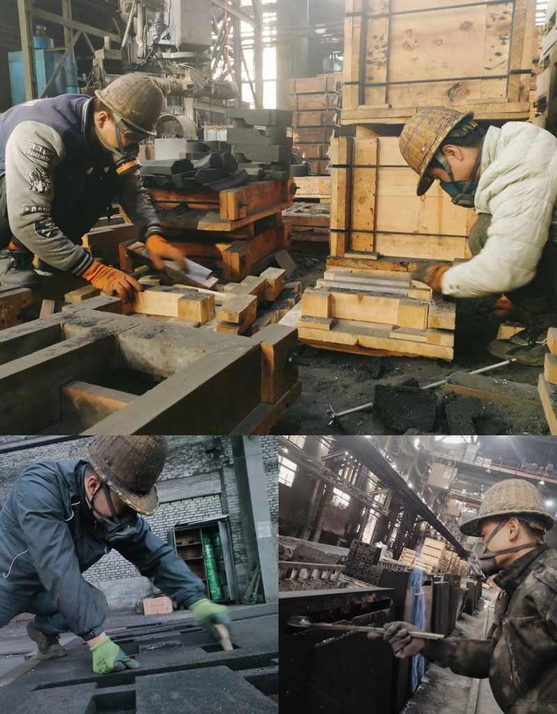 在鑄造公司,師傅們佩戴防護口罩,為趕制砂芯而爭分奪秒。有造型的,有填砂的,有刷涂料的………忙的不亦樂乎。