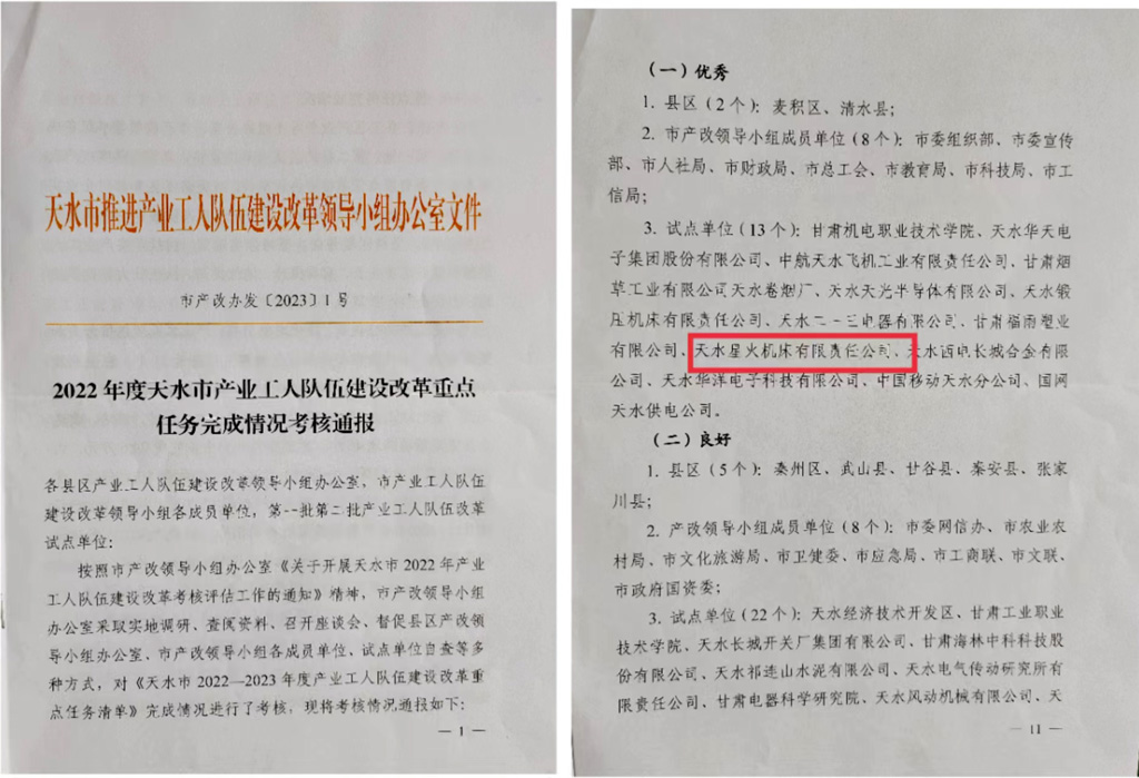 日前,天水市產(chǎn)業(yè)工人隊(duì)伍建設(shè)改革領(lǐng)導(dǎo)小組辦公室采取了實(shí)地調(diào)研、查閱資料、召開座談會(huì)、試點(diǎn)單位自查等多種方式,對《天水市2022—2023年度產(chǎn)業(yè)工人隊(duì)伍建設(shè)改革重點(diǎn)任務(wù)清單》完成情況進(jìn)行了考核,通報(bào)結(jié)果顯示,天水星火機(jī)床有限責(zé)任公司被評為優(yōu)秀試點(diǎn)單位。