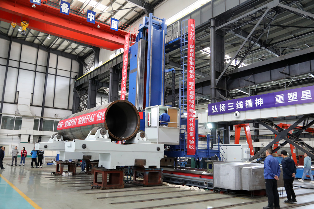該超大直徑筒體數(shù)控開(kāi)孔設(shè)備主要采用五軸聯(lián)動(dòng)銑鏜加工技術(shù)、超大型筒體摩擦伺服驅(qū)動(dòng)技術(shù)、三維視覺(jué)掃描定位技術(shù)、程序參數(shù)化編程等關(guān)鍵技術(shù),用于超大筒型零件表面開(kāi)孔、孔口坡口的粗加工、半精加工和精加工。具有高精高效、結(jié)構(gòu)合理、操作方便、可靠性強(qiáng)等特點(diǎn),是目前國(guó)內(nèi)規(guī)格最大、技術(shù)水平最高、生產(chǎn)難度和自動(dòng)化控制程度最高的首臺(tái)(套)專(zhuān)用設(shè)備。突破了船舶制造等相關(guān)領(lǐng)域的技術(shù)壁壘,解決了我國(guó)無(wú)法依賴(lài)進(jìn)口等手段實(shí)現(xiàn)全自動(dòng)機(jī)械加工,精度低、勞動(dòng)強(qiáng)度大等 “卡脖子”難題。