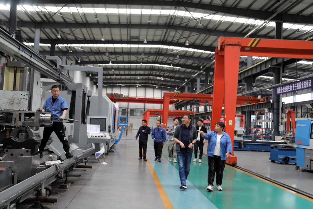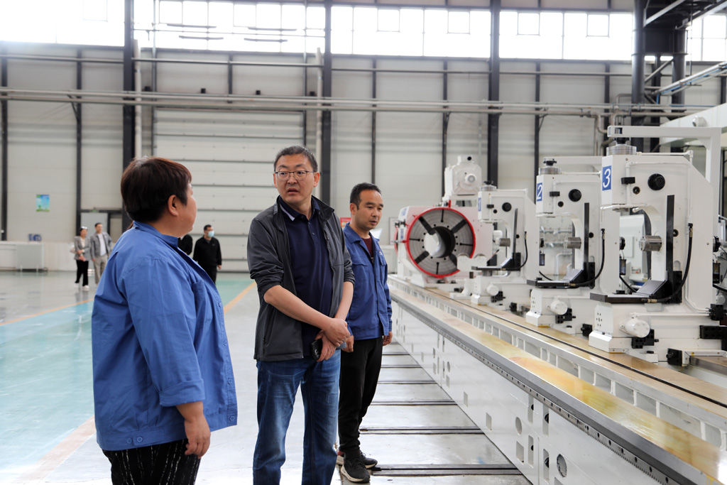 藺峰一行深入生產(chǎn)車間裝配現(xiàn)場(chǎng),參觀生產(chǎn)場(chǎng)景和公司特色創(chuàng)新產(chǎn)品,在參觀調(diào)研中,展海瑜重點(diǎn)介紹了公司技術(shù)創(chuàng)新和發(fā)展經(jīng)營(yíng)等情況,對(duì)公司自主研發(fā)生產(chǎn)的高端數(shù)控纏繞機(jī)床、高精度大型數(shù)控軋輥磨床、大型五軸聯(lián)動(dòng)機(jī)床、船舶用超大直徑筒體加工專用機(jī)床等各類產(chǎn)品的特點(diǎn)、用途、應(yīng)用領(lǐng)域及市場(chǎng)前景做了詳細(xì)講解。并就目前產(chǎn)業(yè)政策、產(chǎn)業(yè)集群和產(chǎn)業(yè)協(xié)同發(fā)展等方面問(wèn)題與藺峰一行作了深入交流。