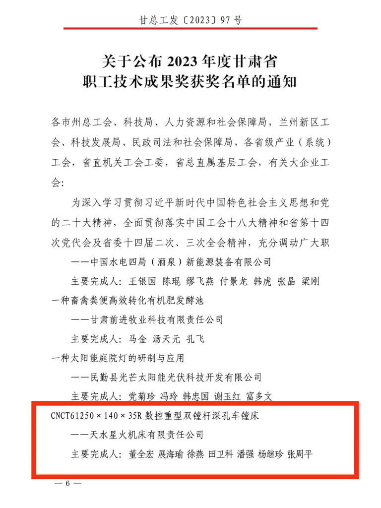 日前,省總工會(huì)、省科學(xué)技術(shù)廳、省人力資源和社會(huì)保障廳聯(lián)合公布了第十六屆(2023年)甘肅省職工優(yōu)秀技術(shù)創(chuàng)新成果獲獎(jiǎng)名單,星火機(jī)床公司董全宏、展海瑜等人完成的CNCT61250×140×35R 數(shù)控重型雙鏜桿深孔車鏜床榜上有名,榮獲二等獎(jiǎng)。