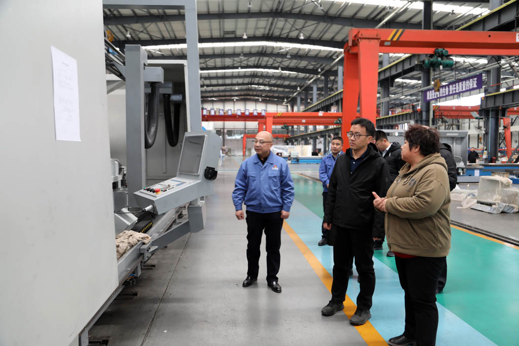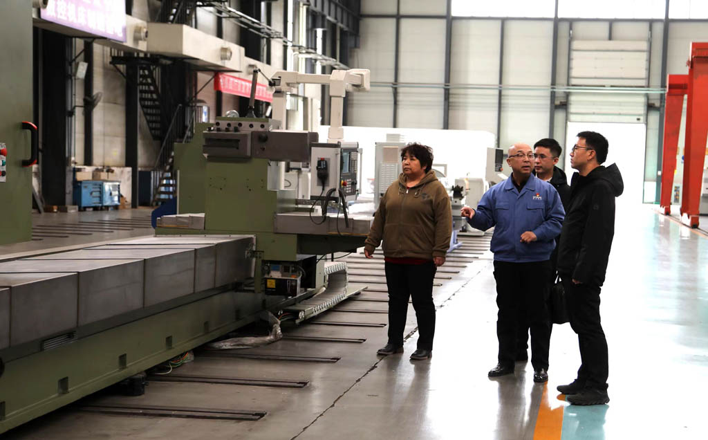 在工業(yè)園生產(chǎn)現(xiàn)場,蔣俊向張曉亮一行詳細(xì)介紹了企業(yè)的發(fā)展歷程、生產(chǎn)經(jīng)營、產(chǎn)品研發(fā)、技術(shù)創(chuàng)新、項(xiàng)目進(jìn)展以及人才培養(yǎng)等情況,并結(jié)合現(xiàn)場裝配中的產(chǎn)品向大家詳細(xì)介紹了重型臥式車床、五軸聯(lián)動(dòng)車銑復(fù)合加工中心、長軸機(jī)床以及車輪車機(jī)床等產(chǎn)品。張曉亮對公司的產(chǎn)品性能、用途以及市場前景等表現(xiàn)出極大興趣,不時(shí)的提問并認(rèn)真溝通。