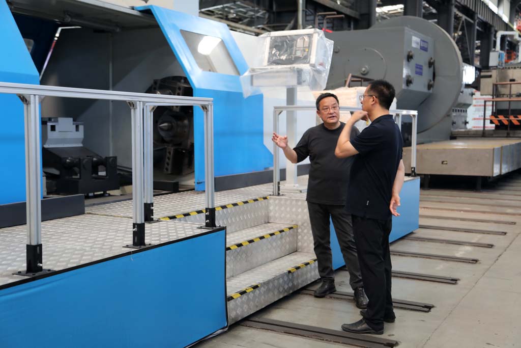 劉建一行在蔣保權(quán)陪同下參觀了工業(yè)園加工車間和各類產(chǎn)品裝配現(xiàn)場(chǎng),向調(diào)研組重點(diǎn)介紹了生產(chǎn)裝配中的數(shù)控重型臥式車床、車輪車床以及五軸聯(lián)動(dòng)機(jī)床等典型設(shè)備,并簡(jiǎn)單回顧了企業(yè)的發(fā)展歷程和歷史沿革。