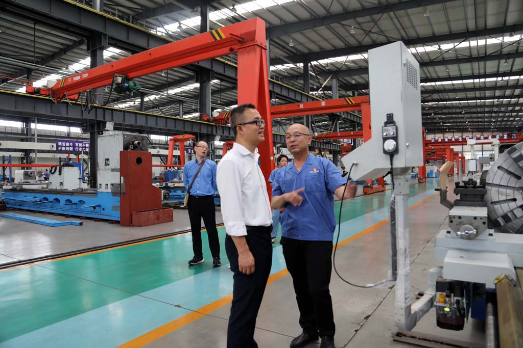 周勝一行在蔣俊陪同下深入工業(yè)園加工車間、裝配車間以及青重公司生產(chǎn)車間,參觀了裝配中的各類車床產(chǎn)品,了解了車床裝配流程。考察中,蔣俊就公司生產(chǎn)經(jīng)營、市場規(guī)模、智能制造、人才培訓(xùn)、科技研發(fā)等情況向周勝一行作了介紹,并結(jié)合裝配中的產(chǎn)品介紹了五軸聯(lián)動機(jī)床、軋輥磨床以及青重車輪車機(jī)床等產(chǎn)品的性能特點(diǎn)、市場前景以及應(yīng)用領(lǐng)域等。蔣俊說,星火機(jī)床作為曾經(jīng)的“三線”企業(yè),經(jīng)過多年的摸爬滾打,在地區(qū)裝備制造業(yè)中占有一席之地,近年來,公司搶抓國家大力發(fā)展裝備制造業(yè)的機(jī)遇,堅(jiān)持以市場為導(dǎo)向進(jìn)行創(chuàng)新研發(fā),開發(fā)了一系列新產(chǎn)品,得到了市場的認(rèn)可。