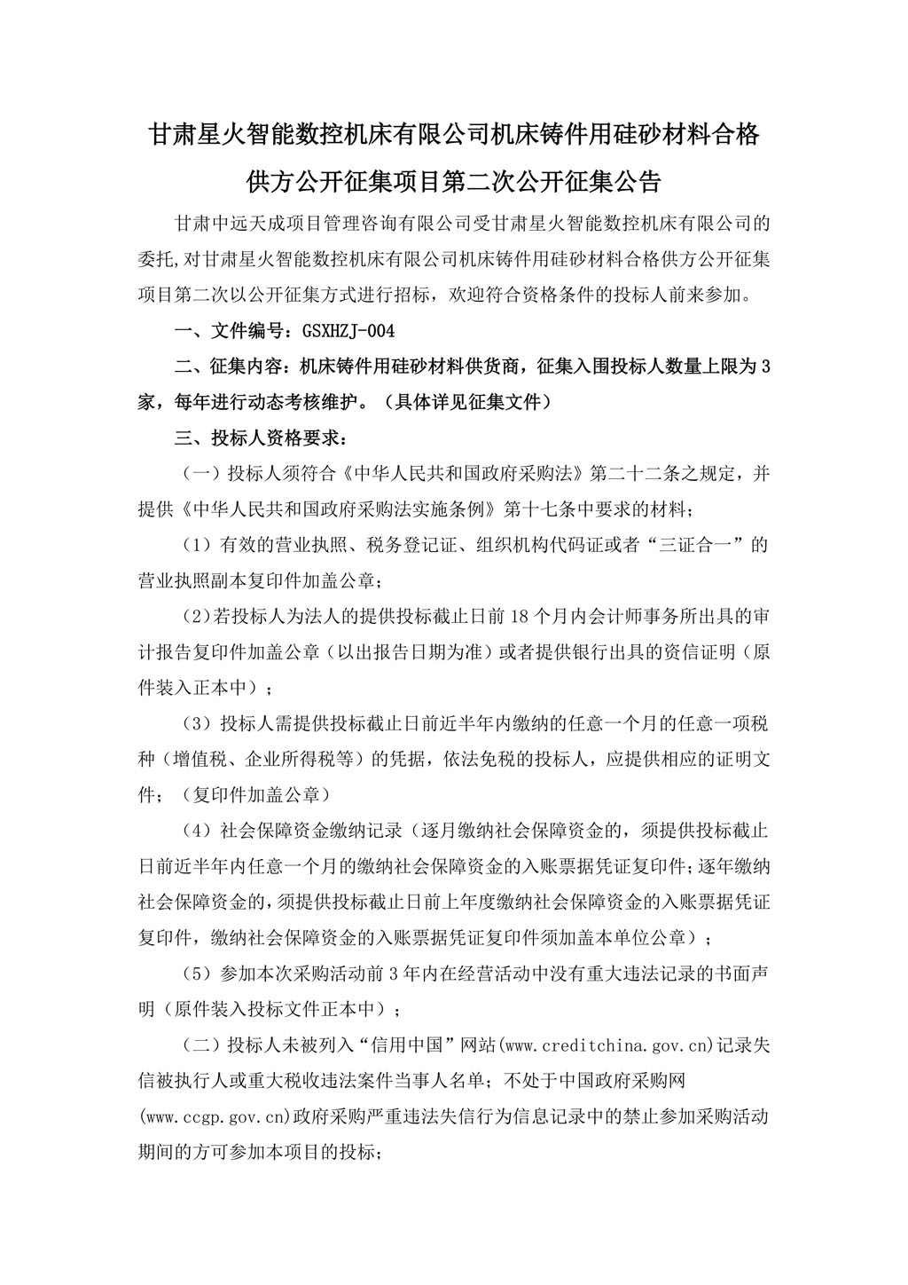甘肅星火智能數(shù)控機(jī)床有限公司機(jī)床鑄件用硅砂材料合格供方公開征集項目第二次公開征集公告